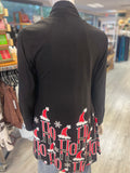 Sweeten up your season in style! This festive black knit kimono is sprinkled with swirling snowflakes and adorned with whimsical santa hats & in red and white. Light, cozy, and full of holiday cheer, it’s the perfect layer for decking the halls, dashing through the snow, or simply sipping cocoa in candy-cane comfort.