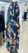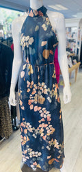 This refined satin halter maxi dress combines elegance with practical design details. The mock neck and halter neckline tie securely at the back for a customizable fit, while the luxurious satin fabric showcases an intricate floral print. A discreet back zipper ensures effortless dressing, and partial lining provides comfort and structure where it matters most. Perfect for formal events, galas, or upscale occasions, this piece delivers sophisticated style with thoughtful construction that prioritizes both aesthetics and wearability.