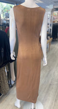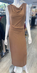 This sleeveless midi dress features an elegant cowl neckline that drapes gracefully for a sophisticated silhouette. Strategic ruching along the right side creates flattering dimension and visual interest, while the fully lined construction ensures comfort and confidence. Perfect for elevated occasions or refined everyday styling, this piece combines timeless elegance with modern design details.