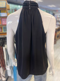 The Lavender Brown Galiea Top is a sophisticated black sleeveless piece featuring a halter-style high neck for an elegant silhouette. It offers subtle allure with slits at the front and back, balanced by a fully lined interior for comfort. Covered buttons adorn the back of the neck, adding a refined finishing detail, making this top perfect for both polished daywear and chic evening looks.